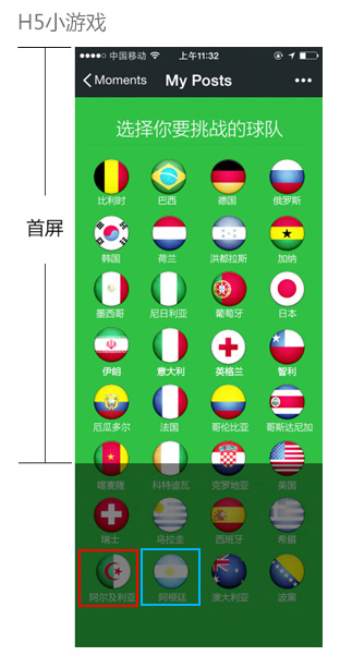 下例H5小游戲在開始前會進行一段動畫,部分用戶在動畫過程中就開始點擊頁面。右圖是游戲界面,點擊“射門”按鈕射門,但是有15%的用戶會先點擊移動的人頭(好有趣啊- -//)。