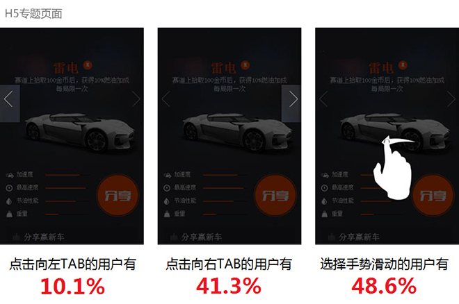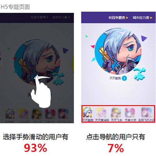 下例H5專題頁面,用戶可以手勢滑動切換游戲,也可以點擊下面的導航切換游戲。93%的用戶選擇手勢滑動,只有7%的用戶選擇點擊導航。