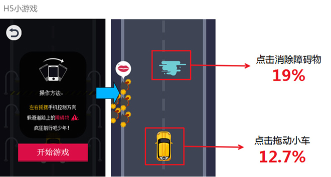 下例的H5小游戲開始前有操作方法提示,玩法是晃動手機(像控制真車方向盤一樣)控制小車左右移動躲避障礙物。但是有19%的用戶選擇點擊消除障礙物,12.7%的用戶選擇點擊拖動小車,直接忽略教程。