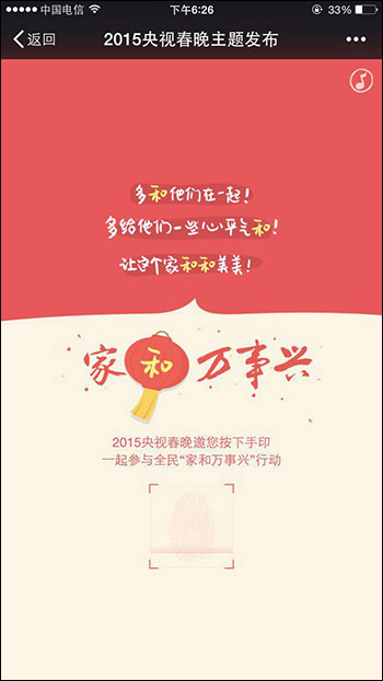 H5也是一樣。2014年,一款《家和萬事興》的H5在朋友圈掀起了一波行動的浪潮,也開啟了指紋互動的先河,親情,就是它的背景。