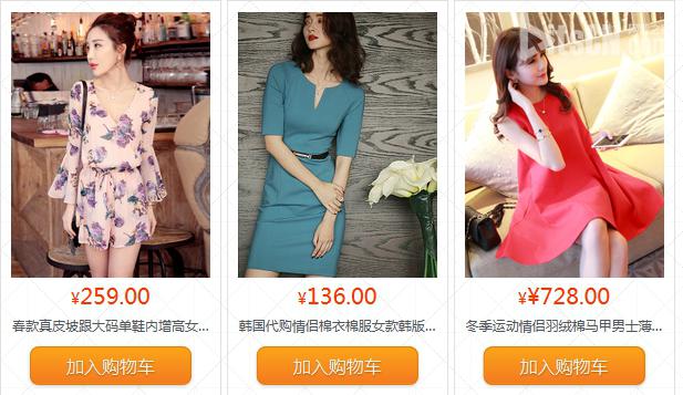 <div class="demo clearfix"> <div class="per"> <img src="images/1.jpg" width="180" height="240" alt="圖片二" /> <h3>¥<span>259.00</span></h3> <div class="title">春款真皮坡跟大碼單鞋內增高女士鞋子</div> <a href="javascript:void(0);" class="button orange addcart">加入購物車</a> </div> <div class="per"> <img src="images/2.jpg" width="180" height="240" alt="圖片二" /> <h3>¥<span>136.00</span></h3> <div class="title">韓國代購情侶棉衣棉服女款韓版羊羔毛大衣</div> <a href="javascript:void(0);" class="button orange addcart">加入購物車</a> </div> <div class="per"> <img src="images/3.jpg" width="180" height="240" alt="圖片三" /> <h3>¥<span>¥728.00</span></h3> <div class="title">冬季運動情侶羽絨棉馬甲男士薄馬甲</div> <a href="javascript:void(0);" class="button orange addcart">加入購物車</a> </div> <div class="per"> <img src="images/4.jpg" width="180" height="240" alt="圖片四" /> <h3>¥<span>119.00</span></h3> <div class="title">原創-城市簡約文藝純色棉麻新中式小立領</div> <a href="javascript:void(0);" class="button orange addcart">加入購物車</a> </div> </div>