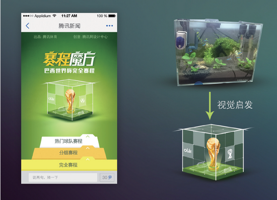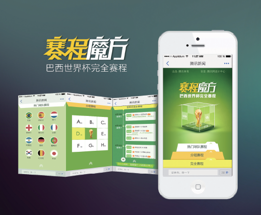 在2014巴西世界杯期間,我們與騰訊體育推出了一款世界杯賽程H5頁面。在項目之初,我們就希望這一款小產品在內容定位+視覺設計+交互設計三個維度上可以高度統一,三位一體,圍繞世界杯賽程賽事賽時這一中心,內容、交互、視覺密不可分;即設計與交互體現內容,內容反方向印證視覺與交互,將常規的體育賽程表通過多屏展現,時間軸表現等與H5交互特性緊密結合起來,創造出一種大家喜聞樂見的界面展示方式。隨後小產品一經推出,賽程魔方(見圖2)即引爆朋友圈,前後被復制抄襲幾十次,從另一方面也印證團隊定位的准確,形式與內容高度統一是項目成功的一大法寶。