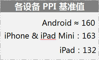 注意,這裡給的是基准值,我們常說的 iPhone 多少多少 PPI,那個值是用基准值乘以設備像素比得出來的。由於 Android 手機廠商眾多,並沒有統一的標准,這裡的 160 只是約等值,所以 Android 屏幕尺寸結果會有誤差,但是基本也夠用了。