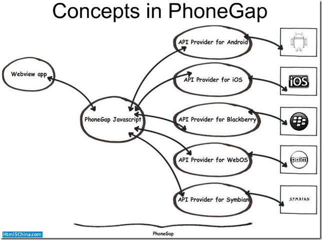 2)有了PhoneGAP,用HTML5寫好程序後就能生成多個手機平台版本的本地應用,目前支持7個平台:Android、iOS、WindowsPhone、HP WebOS、BlackBerry、 Symbian、Bada。