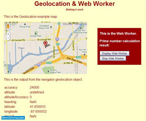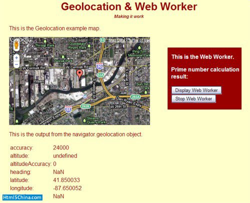 在執行時,網頁的顯示如圖2所示。如果要查看地理位置數據的話,你首先必須要同意共享你的信息。web worker在頁面加載時啟動,如果你想看一看找到的素數的話,點擊Display Web Worker按鈕。