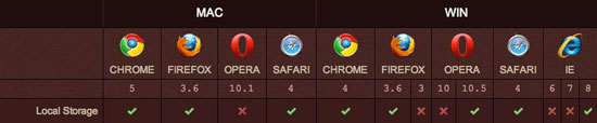 盡管顯然不支持所有的浏覽器,我們可以在Internet Explorer8時,Safari 4和Firefox 3.5下期待此工作方式。請注意,為了彌補舊的浏覽器將無法識別本地存儲,你應該先測試,以確定window.localStorage是否存在。
