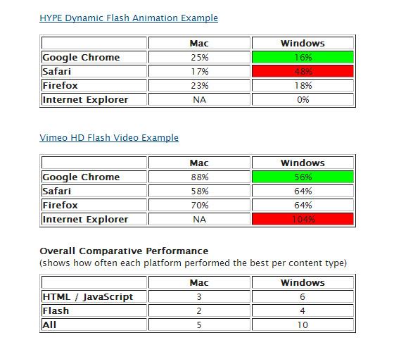 這個爭論由來已久,Flash 被某些開發設計者濫用導致一些網頁加載緩慢,而 HTML5 為之帶來一線曙光。拿仍在襁褓中的 HTML5 和已經有10年歷史的 Flash 進行比較也許有失公允,但這是人人都關心的一個問題。相對 Windows 用戶來說,Mac 用戶可能會從 HTML5 獲得更多好處,因為蘋果一直不願支持 Flash。下面是 Mike Chambers 針對 Mac 和 Windows 平台浏覽器的 CPU 負載而做的一部分測試: