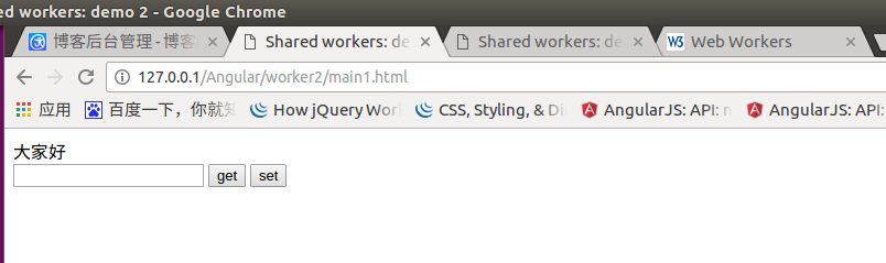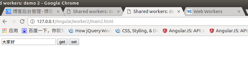 這裡分析一波,我們在main1.html的文本框輸入數據,點擊set,然後在main2.html中點擊get法現能夠獲取到我們在main1.html中設置的數據,這說明我們的sharedWorker事實上是單例的,就像java中的static類一樣,不管new多少個,實際上只有一個,這樣我們的不同線程就可以共享到sharedWorker中的數據了。這裡把圖給上,記得有篇文章沒給圖,然後有人給我建議了,問能不能給圖。