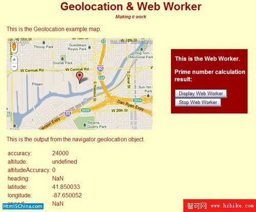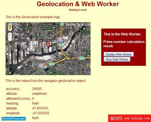在執行時,網頁的顯示如圖2所示。如果要查看地理位置數據的話,你首先必須要同意共享你的信息。web worker在頁面加載時啟動,如果你想看一看找到的素數的話,點擊Display Web Worker按鈕。