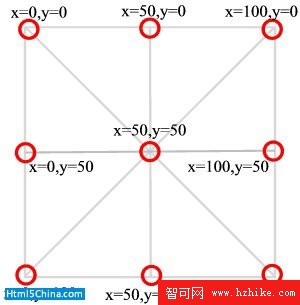 4. 中間的點是x=50,y=50。