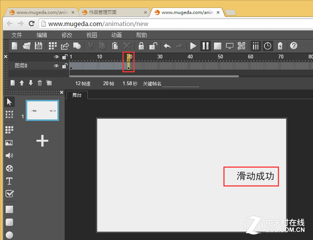 2、 在圖層0的第20幀處輸入“滑動成功”文字,位置靠右,如圖下所示: