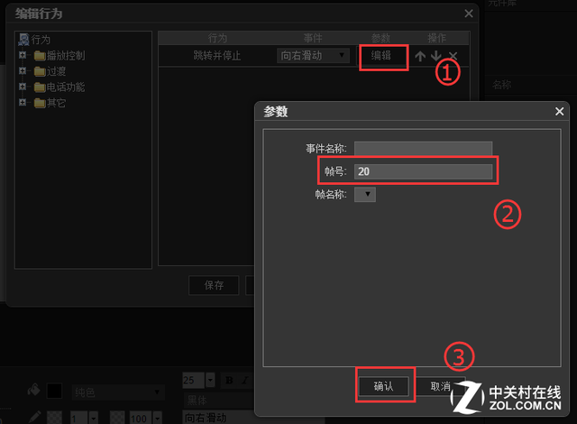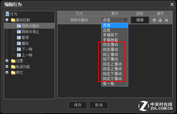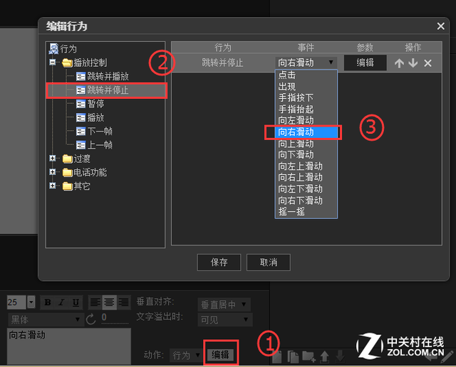 4、 點擊怕【編輯】,展開行為編輯對話框,展開播放控制,選擇【跳轉並暫停】,展開事件,選擇【向右滑動】,如下圖所示: