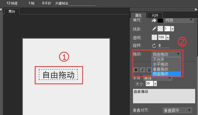 2、選中文字,在屬性面板上展開拖動,選擇【自由拖動】,如下圖所示: