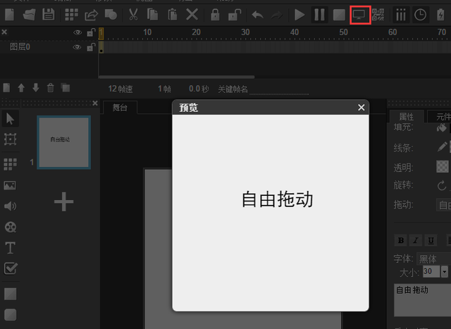 1、在舞台上輸入“自由拖動”文字,如下圖所示: