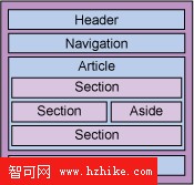 Html5中加入了全新的結構型元素,例如頁眉header,頁腳footer,導航nav,內容article,章節section等。含義如下圖所示: