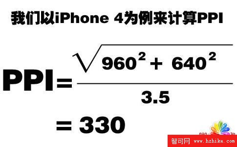 PPI,有時也叫DPI,所表示的是每英寸所擁有的像素(pixel)數目,數值越高,即代表顯示屏能夠以越高的密度顯示圖像。(注:這裡的像素, 指的是device pixels。)搞清楚了PPI是什麼意思,我們就能很容易理解PPI的計算方式了,我們需要首先算出手機屏幕的對角線等效像素,然後處以對角線(我們平 常所說的手機屏幕尺寸就是說的手機屏幕對角線的長度),就可以得到PPI了。准確的計算公示大家可以參照下圖。比較有意思的是,根據公式計算出來的 iPhone 4的PPI為330,要比蘋果官方公布的326要高一點點。
