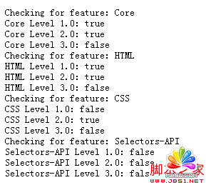 6.獲取dom屬性實現的信息 document.implementation屬性幫助你了解浏覽器對dom屬性的實現情況。該屬性返回DOMImplementation對象,對象包含hasFeature方法,你可以通過該方法了解浏覽器對某屬性的實現情況。