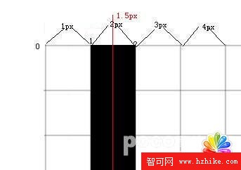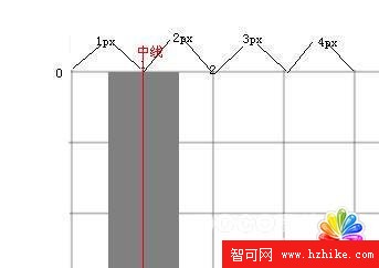 但遺憾的是canvas的線條畫法不一樣,上一篇文章我們已經說了,canvas的每條線都有一條無限細的“中線”,線條的寬度是從中線向兩側延伸的。如果我們還是從第2個像素點畫一條線,那麼線條的中線就會靠齊到第2個像素的起點,然後我們開始畫了,問題也就來了:Canvas 的線條以中線向兩側延伸,而不是向某一邊延伸(比如這裡,如果只是往右側延伸,那麼我們的問題就不再是問題了),延伸過後我們的線條實際上是這樣的: