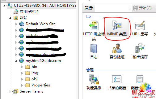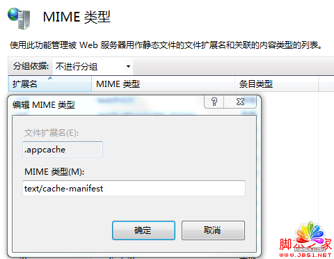 1.比如後綴名為.appcache,打開IIS7,選擇根節點(這樣所有站點都會繼承配置,也可以針對單個站點配置);