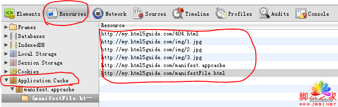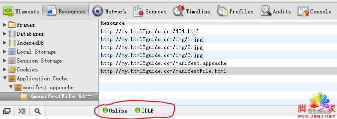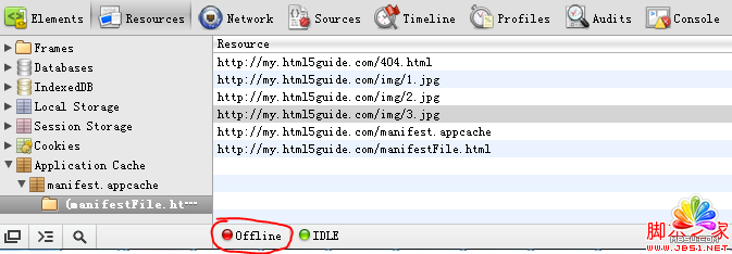 2.2.下面解釋第二個問題,這裡需要借助chrome浏覽器的調試工具,使用Chrome浏覽器打開我們的web程序,按F12,切換到Resources選項卡。只要Application Cache下面有我們配置的信息,能找到緩存的文件,就證明我們的離線應用創建成功了。