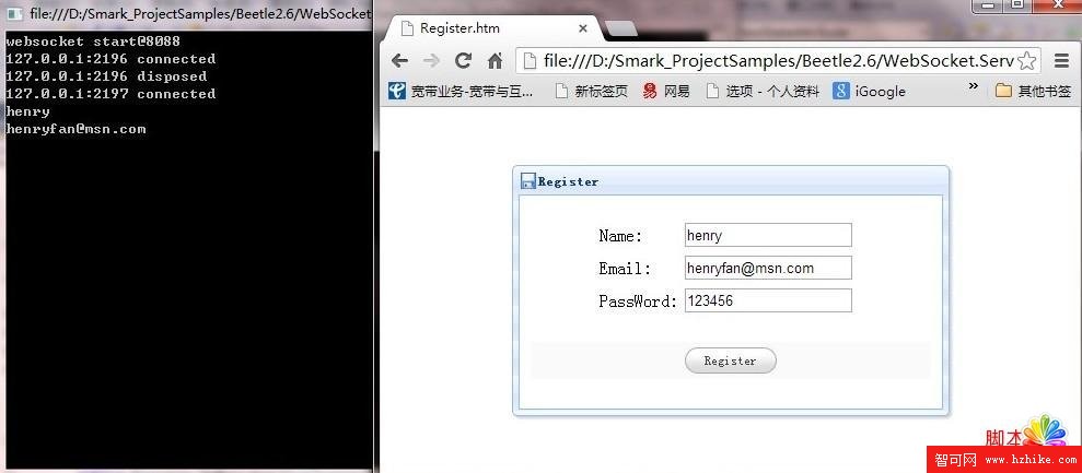 下面通過一個簡單的用戶注冊來體現Html5用josn和websocket進行交互的處理過程.由於經過封裝處理所以使用起來非常方便.
