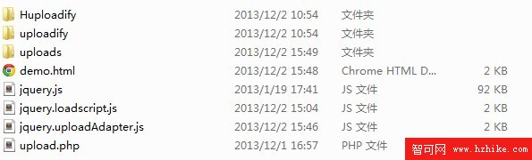 其中Huploadify就是我上一篇所寫的Html5版,uploadify為官方的Flash版本,原封不動放在這裡。為了動態調用JS和CSS文件,我還專門寫了一個jquery.loadscript.JS,用來動態加載文件。這樣所需的東西就全了。