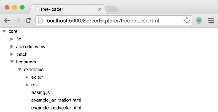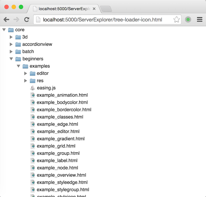 到此,一個簡單的服務器就搭建好了,現在可以通過http://localhost:5000來訪問服務器了。等等,好像缺了點什麼。對了,獲取系統文件目錄結構的方法忘記給了,OK,那麼我們就先來看看獲取整站文件的代碼是怎麼寫的: