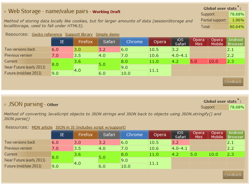 web storage和內置JSon 具體支持情況 高亮部分為當前浏覽器版本。