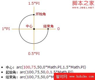 cxt.arc(100,100,50,Math.PI*0.75,Math.PI*1.75,false);/*繪制一段半圓弧線,圓心坐標是100,100;開始弧度是0.75,結束弧度是1.75,最後一個參數False = 順時針,true = 逆時針,當然,這個參數可選的*/