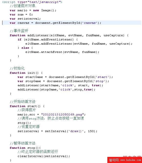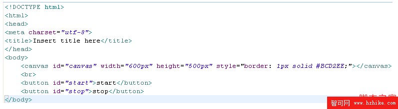 2.新建一個Html5文件,此處命名為mario.Html,定義canvas元素,開始動畫start按鈕,暫停動畫stop按鈕