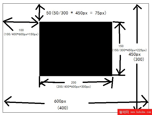 在canvas中畫圖是基於坐標的,所以100, 50的坐標轉化成了150px,75px的屏幕坐標,矩形的大小也由200*150轉換成300px*225px的屏幕大小。