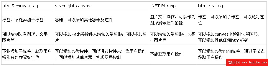canvas具有繪圖的功能,但是在用戶交互上似乎比較乏力。拿silverlight的canvas、.Net的Bitmap、Html的div與canvas對比了一下: