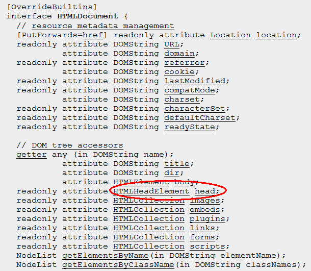 後面的是我們常用的方式,前面的 document.head 著實第一次見。查資料發現原來是Html5的東東。的確簡單了,一個屬性搞定。