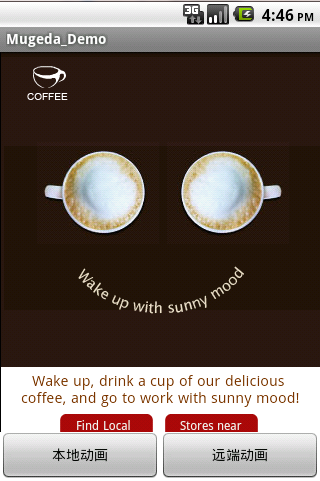 下面用一個實例在演示如何使用,這個實例的界面如下圖所示。中間的白色區域是WebView用來展現Mugeda動畫。點擊本地動畫按鈕讓WebView加載本地動畫,點擊遠端動畫讓WebVIEw加載遠端服務器上的動畫。