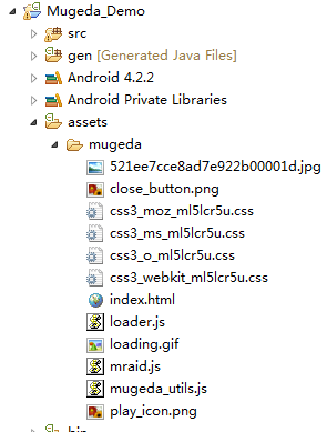 首先需要創建一個android工程,這裡不贅述了。創建好工程之後,為了加載本地動畫,首先需要將Mugeda動畫添加到工程中,我們將它放到assets目錄下。