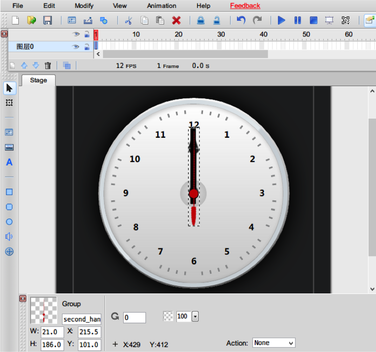 在0圖層、1幀導入鐘面、時針、分針和秒針四個圖片。
