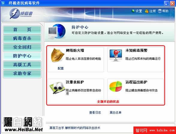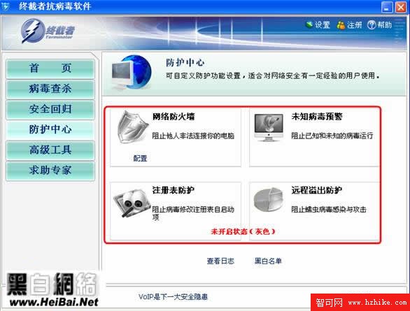 終截者的防護措施做的也很完善,單擊打開“防護中心”,在右側我們可以看到關於系統防護的幾項安全措施,網絡防火牆、未知病毒預警、注冊表防護、遠程溢出防護等。這些功能在未開啟的狀態下顯示為灰色(圖1),開啟以後變為彩色(圖2),小編個人建議用戶全部開啟,以便系統得到最大級別的防護