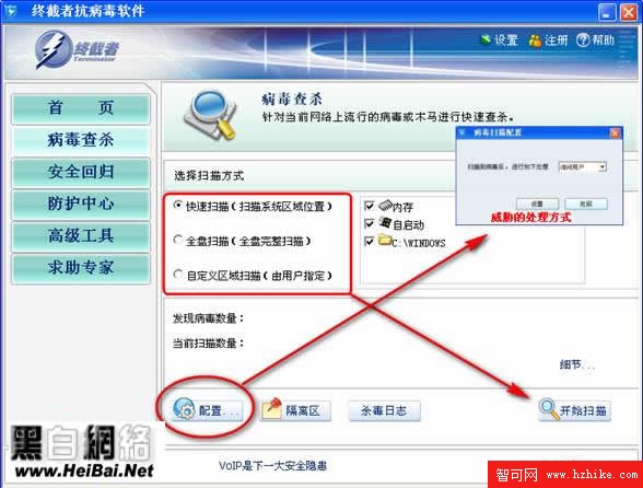 軟件提供了一整套的查殺服務,從單個磁盤掃描到完整計算機的掃描都包含在內,單擊打開“病毒查殺”在右側設置你需要掃描的位置,單擊“開始掃描”即可,打開配置選項設置好發現威脅的處理方式。