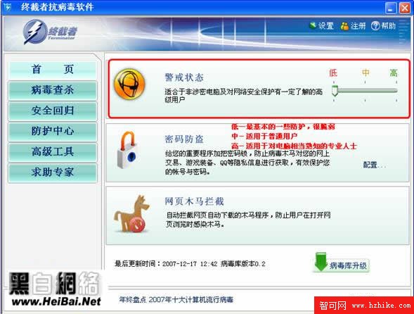 終截者安全防護等級是為了用戶電腦在受安全保護的狀態下能滿足高級用戶在不同環境下對安全級別的不同需求。通過調節安全防護等級可以選擇更適合自己的防護等級.從低-中-高三個等級供用戶選擇