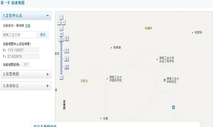 第一步:進入百度創建地圖的網站http://api.map.baidu.com/lbsapi/creatmap/,搜索出自己要展示的位置,如下圖所示。