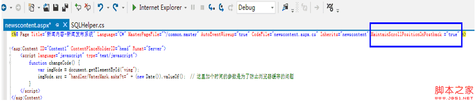 我說一個現象大家一定常見 ,就是在網頁中刪除一些東西的時候滾動條往往還在刪除東西之前的位置,而不是非常不人性化的跑到那一頁的頂部,那麼這是怎麼實現的呢?其實辦法很簡單,只需要在.aspx的源碼中的頂端部分加上 MaintainScrollPositionOnPostback ="true"即可。見下圖: