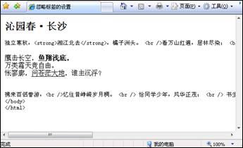 <xmp>獨立寒秋,<strong>湘江北去</strong>,橘子洲頭。 <br />看萬山紅遍,層林盡染; <br />漫江碧透,<u>百舸爭流。</u> <br /></xmp>