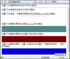 一個簡單的<hr />標簽就可以實現分隔線,輕松地修飾了段落排版,使之更美觀。不過對於不同的應用場合,<hr />默認單一的線條樣式顯然不能滿足要求。<hr />標簽的多種屬性解決了這個問題,常用的屬性有width、size、align、color和title。width即寬度設置,屬性值默認單位為像素,也可以用百分比來表示分隔線所占空間的比例。size可以理解為分隔線的厚度或高度,屬性值默認單位同寬度。align為對齊方式,類似於<p>的align。color即顏色,根據需要設置分隔線的不同顏色。title屬性使用不多,浏覽者光標懸停在分隔線上時出現屬性值的內容提示。