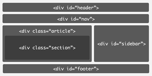圖表說明一個典型的用div元素帶上id和class屬性標記的2欄布局. 其中包括頁首(header)和頁腳(footer), 在頁首下面是一個水平導航條, 主體內容又包含了文章(article)和它右邊的側邊欄(sidebar).