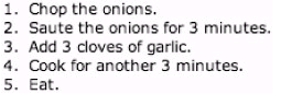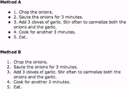 讓我們先來看看編了號的項目清單,以及兩種標記這類清單的做法.或許你一眼就能看出哪種方法比較有益,但是我仍會再度詳細說明這個例子,以便強調結構化標記,使用正確工具解決問題的重要性.