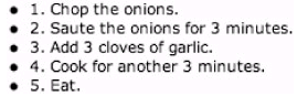由於這是個有編號的清單,因此我們在每個項目之前加上編號,編號之後跟著句號,以便標識每個步驟的順序,但是如果稍侯需要在第2步,第3步之間加上新步驟的話該怎麼辦呢?這下我們需要(手動)為新增步驟之後的所有項目重新編號.對這個清單來說,不是什麼麻煩事,但是如果你正在修改某個具有100個項目的清單時,修改過程就會變得非常冗長乏味了.