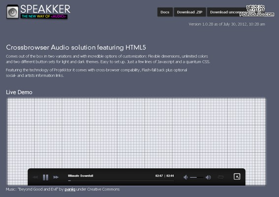 Speakker是一個開源並且可定制的HTML5音樂播放器。利用幾行JavaScript代碼就能夠將它集成到任何網頁中。
