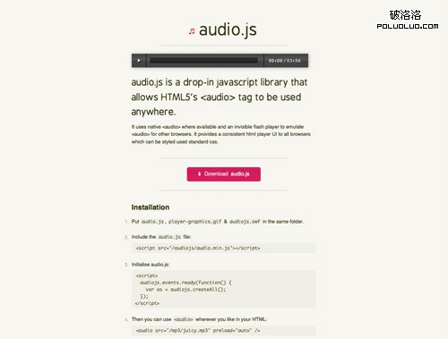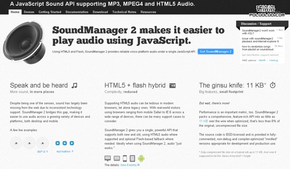 SoundManager 2 利用 HTML5 和 Flash 技術提供了穩定和闊平台的音樂播放功能,只有 10K 的 JS 包。支持MP3, MPEG4 and HTML5 Audio等格式。