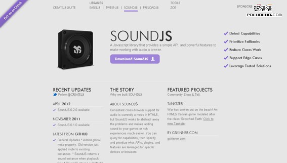 一個JavaScript庫,它提供了一個簡單的API,和強大的功能,使音頻播放變得很簡單。 跨浏覽器支持的音頻是目前一片混亂HTML5,但SoundJS的工作原理抽象出來的問題,使得添加聲音到您的游戲或豐富的經驗更容易。