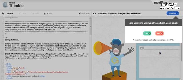 Mozilla今天推出了一款基於網頁的新開發工具Thimble,采用可視化的HTML編輯器幫助用戶以一種輕松愉快的方式進行簡單的網頁編程,並能夠及時的提醒用戶代碼中的錯誤, 並會提供簡單的代碼說明。編程者可以自定義網站“白手起家”或者根據模版進行“DIY修改”,完成之後還能跟全球所有的編程愛好者進行分享提供下載連接。